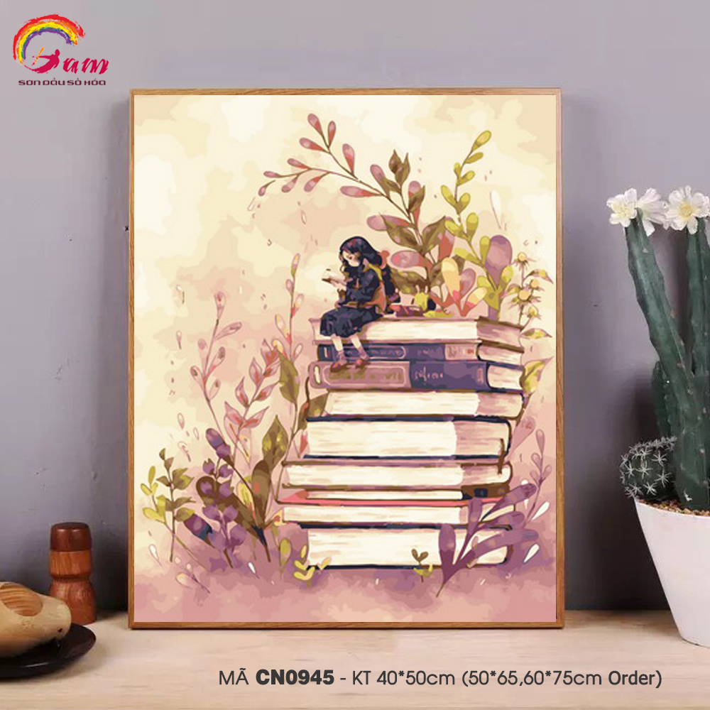 Tranh tô màu theo số sơn dầu số hóa Gam Tranh cô bé ngồi đọc sách CN0945