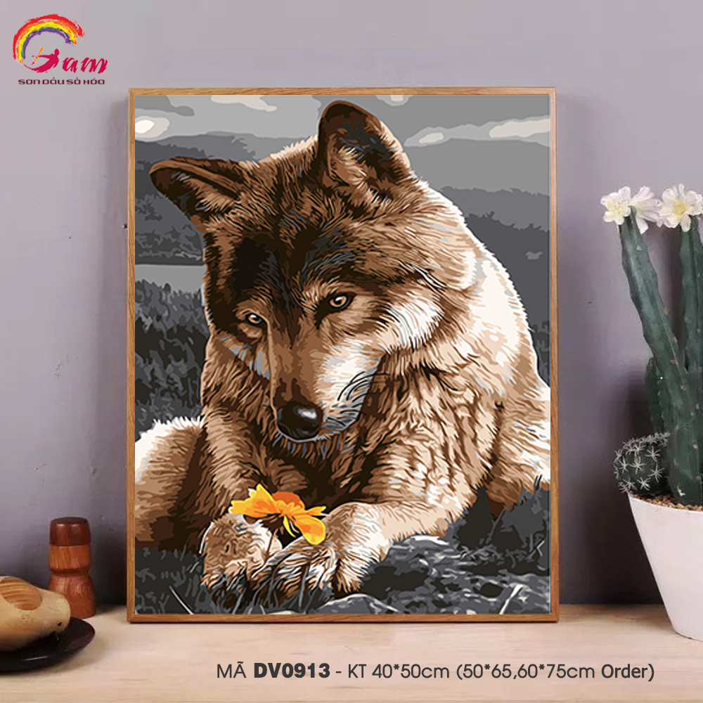 Tranh tự tô màu theo số sơn dầu số hóa Gam Tranh chó sói dịu dàng bên hoa dại DV0913