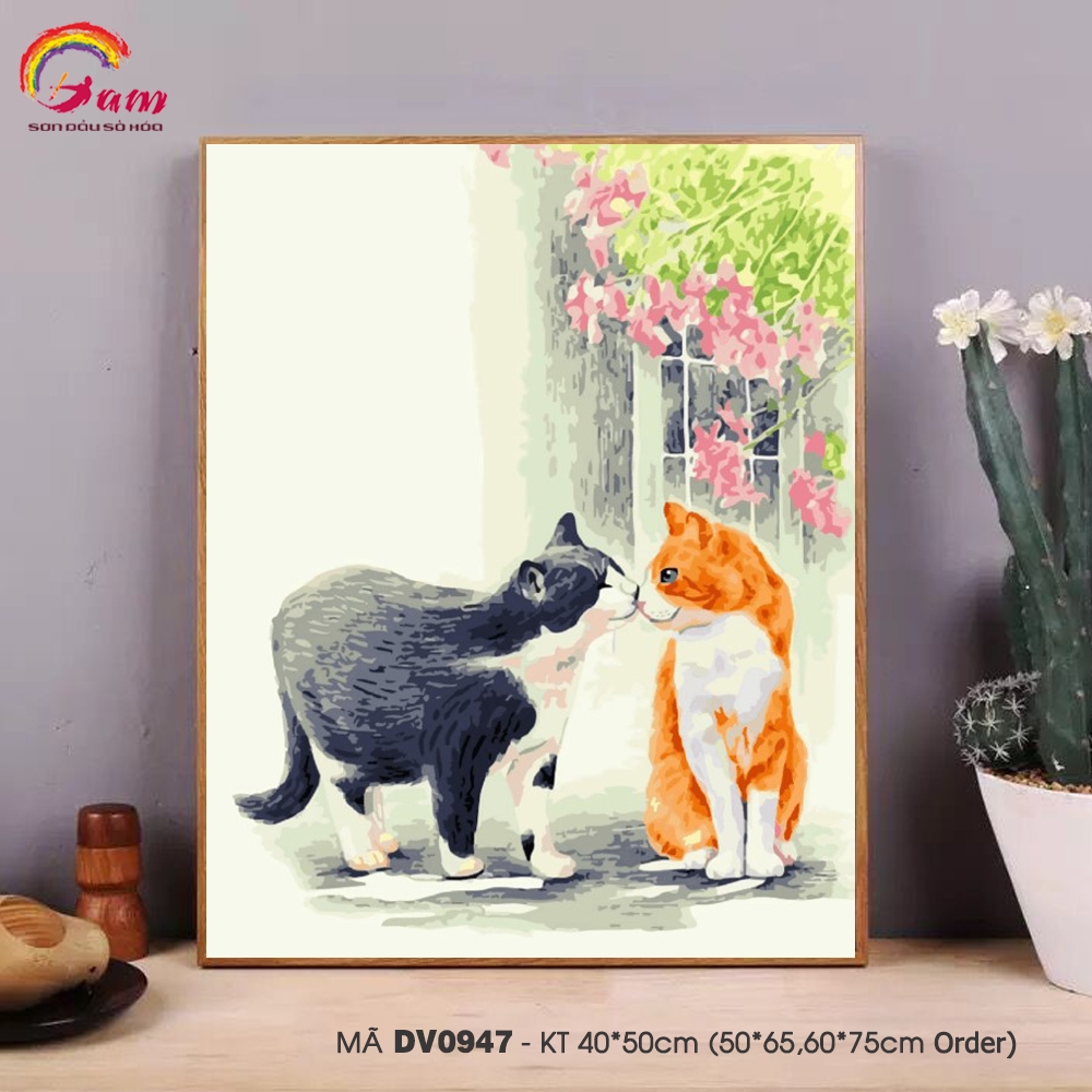 Tranh tô màu theo số sơn dầu số hóa Gam Tranh đôi mèo Mèo đen và mèo vàng DV0947